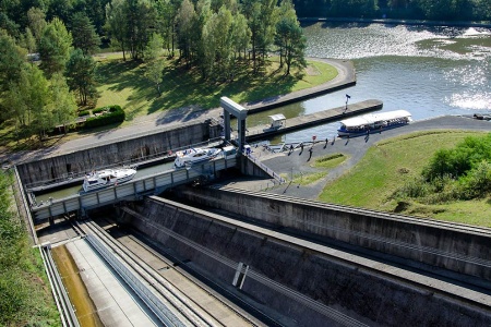 Navigation vers Xouaxange, passage du plan incliné d'Arzviller. Véritable ascenseur à bateaux permettant la traversée des Vosges. Cet ouvrage remplace un chapelet de 17 écluses se succédant sur 4 km et qui demandait autrefois une journée de navigation. Réalisé dans les années 60, il permet de hisser une péniche de plusieurs centaines de tonnes en seulement 4 minutes. Impressionnant.